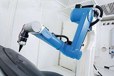 噴涂機器人又叫噴漆機器人(spray painting robot), 是可進行自動噴漆或噴涂其他涂料的工業機器人,1969年由挪威Trallfa公司(后并入ABB集團)發明。噴漆機器人主要由機器人本體、計算機和相應的控制系統組成,液壓驅動的噴漆機器人還包括液壓油源,如油泵、油箱和電機等。多采用5或6自由度關節式結構,手臂有較大的運動空間,并可做復雜的軌跡運動,其腕部一般有2~3個自由度,可靈活運動。較先進的噴漆機器人腕部采用柔性手腕,既可向各個方向彎曲,又可轉動,其動作類似人的手腕,能方便地通過較小的孔伸入工件內部,噴涂其內表面。噴漆機器人一般采用液壓驅動,具有動作速度快、防爆性能好等特點,可通過手把手示教或點位示數來實現示教。噴漆機器人廣泛用于汽車、儀表、電器、搪瓷等工藝生產部門。