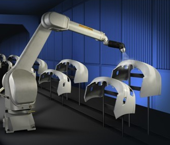 噴涂機器人又叫噴漆機器人(spray painting robot), 是可進行自動噴漆或噴涂其他涂料的工業機器人,1969年由挪威Trallfa公司(后并入ABB集團)發明。噴漆機器人主要由機器人本體、計算機和相應的控制系統組成,液壓驅動的噴漆機器人還包括液壓油源,如油泵、油箱和電機等。多采用5或6自由度關節式結構,手臂有較大的運動空間,并可做復雜的軌跡運動,其腕部一般有2~3個自由度,可靈活運動。較先進的噴漆機器人腕部采用柔性手腕,既可向各個方向彎曲,又可轉動,其動作類似人的手腕,能方便地通過較小的孔伸入工件內部,噴涂其內表面。噴漆機器人一般采用液壓驅動,具有動作速度快、防爆性能好等特點,可通過手把手示教或點位示數來實現示教。噴漆機器人廣泛用于汽車、儀表、電器、搪瓷等工藝生產部門。
