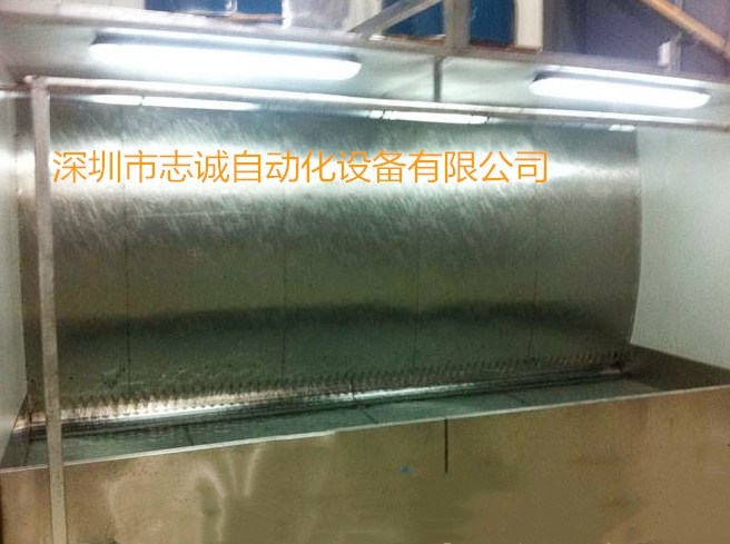 環保型水簾柜(噴漆臺)主要是由自吸水泵循環抽水往水簾板上均勻的流下來,噴槍噴出來的廢氣(漆霧)被水簾板上的水打到下面水池里。再有少部分的廢氣(漆霧)被上面的風機通過排風管道排出車間外面。使車間內沒什么廢氣(漆霧)給大家一個好的工作環境。